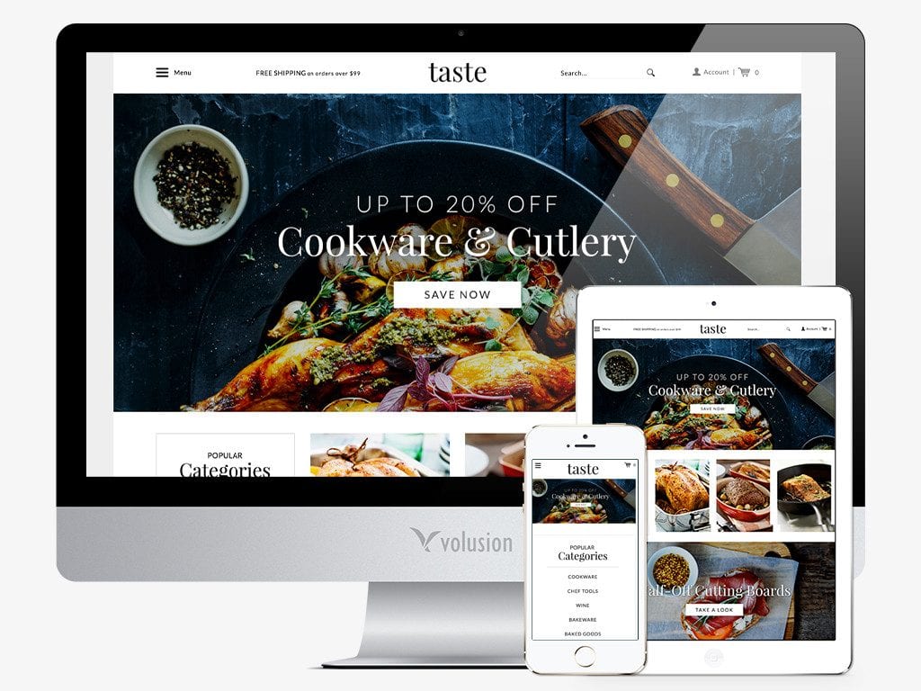 A new fully responsive and mobile friendly theme, Taste gives users a dynamic viewing experience with powerful full-sized images. Taste is perfect for businesses with high quality imagery and branding, and features minimal text, allowing the product to pull the attention of the customer on its own. Volusion’s Taste template costs: $180