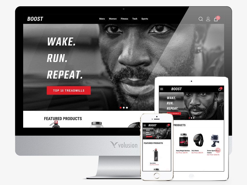 Boost is a responsive template that makes a bold statement. It features a full width slideshow, sticky header, and clean lines, making it great for a variety of industries and products. Volusion’s Boost template costs: Free
