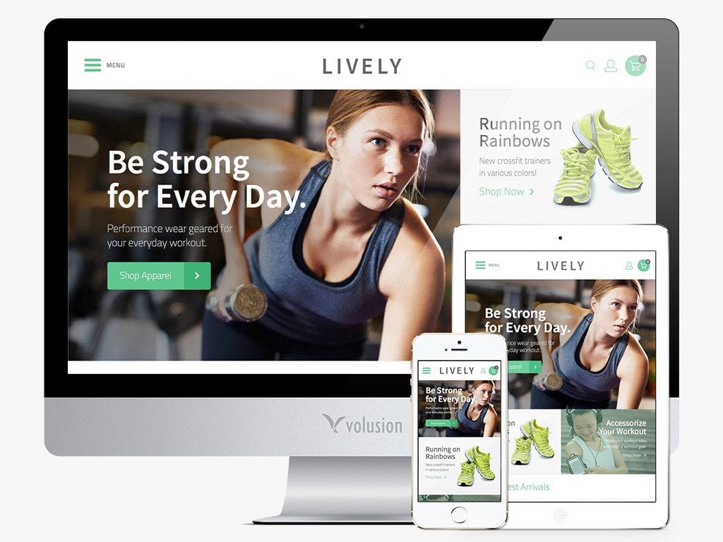 A fully responsive theme, Lively offers seamless integration for mobile and tablet configurations. The calm and soothing color palette is attractive for businesses looking to highlight featured products without distracting design. Volusion’s Lively template costs: $180