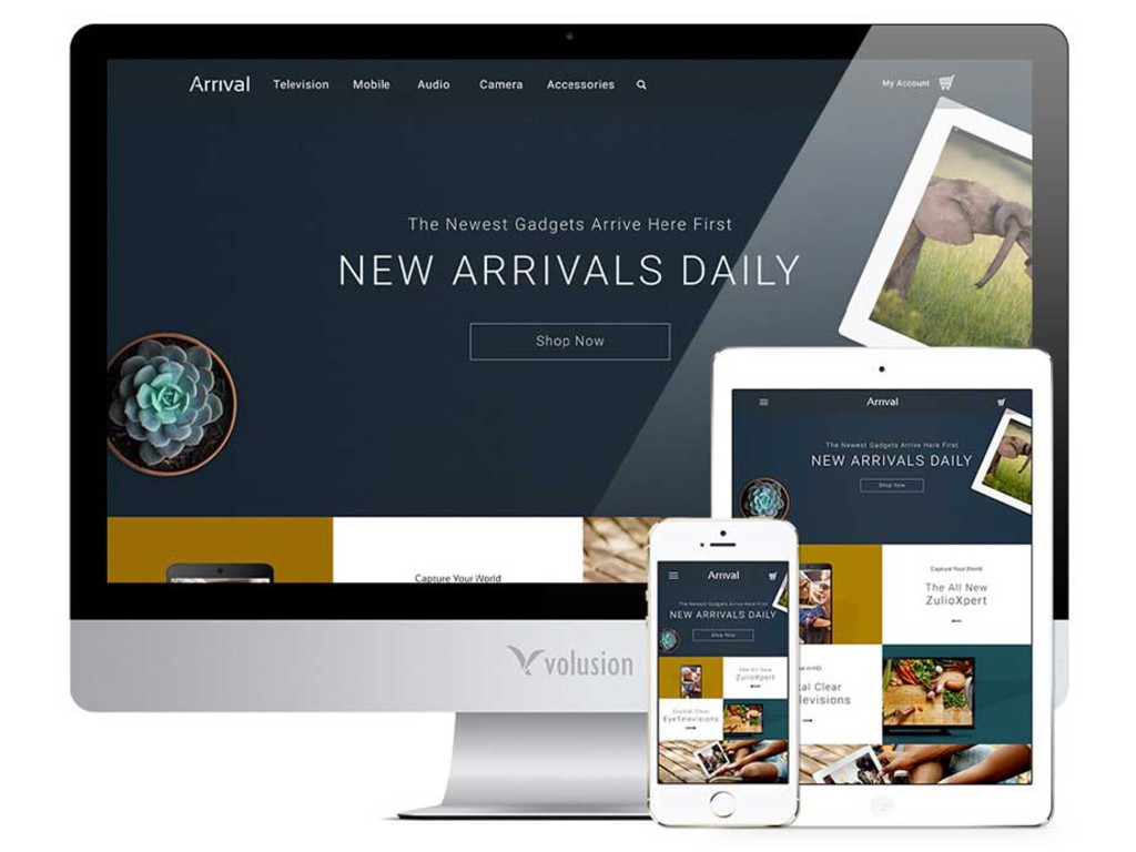 With broad swaths of restful, muted colors and crisp white navigation text, Arrival is a true standout among Volusions fully responsive themes.
