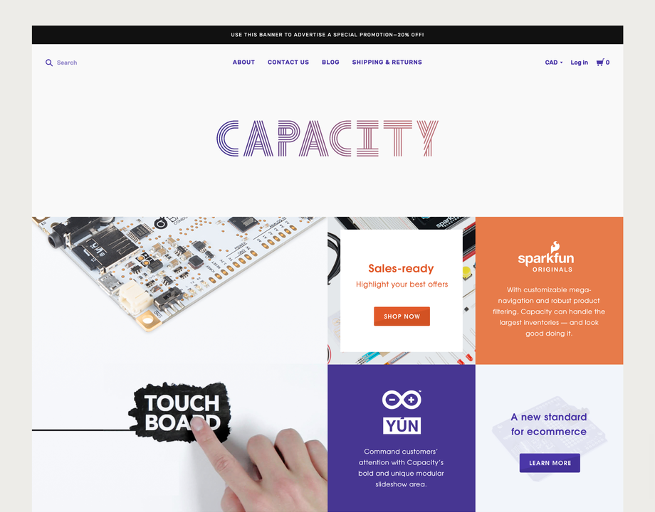 Capacity sets a new standard for ecommerce navigation and search functionality. With its customizable mega-navigation, robust product filtering, and unique modular slideshow area, Capacity is powerful enough to handle the largest inventories—and look good doing it.