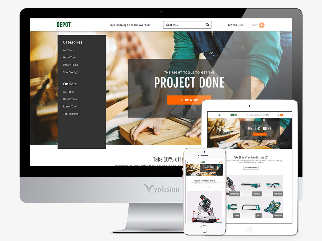Depot is a fully responsive, mobile friendly theme with a large left navigation, making it great for sites with a lot of categories. Depot, is Content Builder enabled, so it’s easy to customize and quickly update for seasonal promotions.