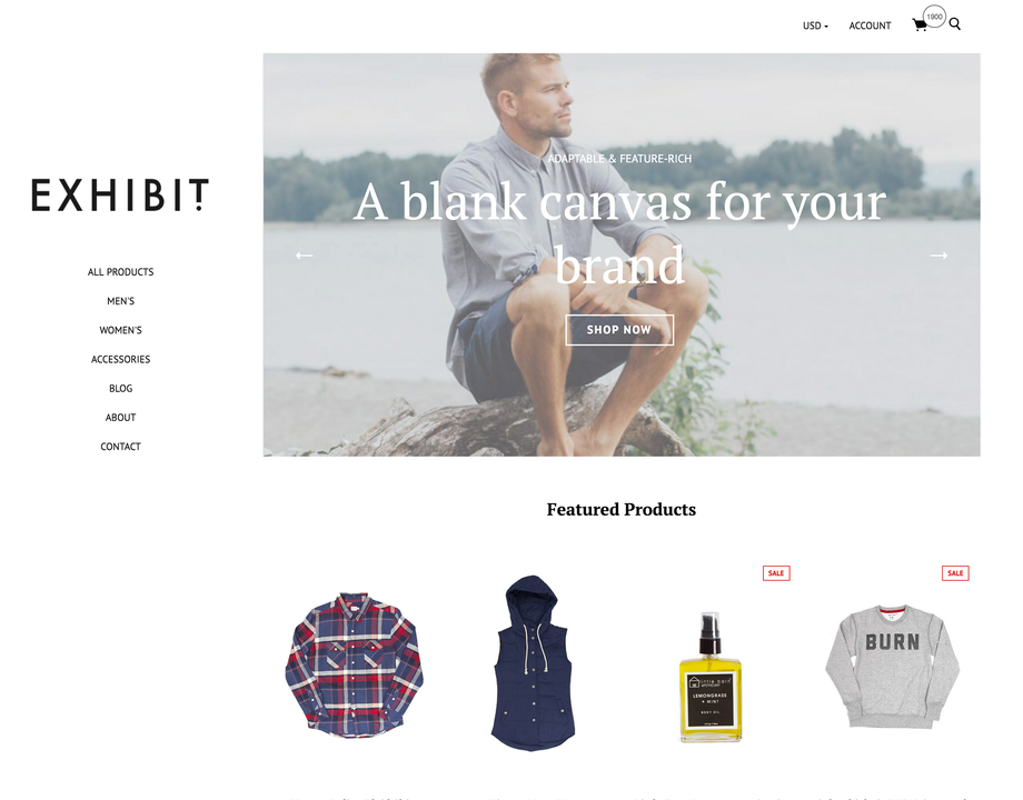 Exhibit is a handsome and feature-rich theme optimized for small-to-medium-sized catalogs. Classic sidebar navigation and distinctive blog post treatment combine to create a design that’s enduring, unexpected and easily brandable. Exhibit your products with a theme that does them justice.