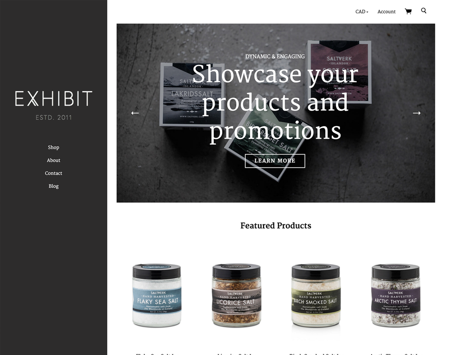 Exhibit is a handsome and feature-rich theme optimized for small-to-medium-sized catalogs. Classic sidebar navigation and distinctive blog post treatment combine to create a design that’s enduring, unexpected and easily brandable. Exhibit your products with a theme that does them justice.