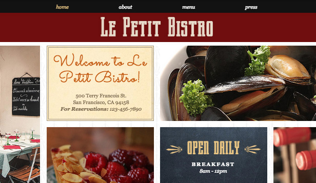 Say “bonjour” to this classy, French bistro website template. The chic design of this template perfectly reflects the elegance of French cuisine and culture. Personalize the welcome board to reflect your restaurant’s opening hours or change the text completely to create a unique French-styled feature for your website. Start editing now to get mouths watering and customers flowing through your doors!