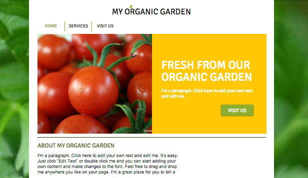 Featuring a clean layout and garden-inspired background, this template is as fresh as your produce! The boxed sections and tabbed menu create a structured feel, while the circular icons give the photo gallery a stylish edge. Start editing to promote your gardening or agricultural business with your own unique website!