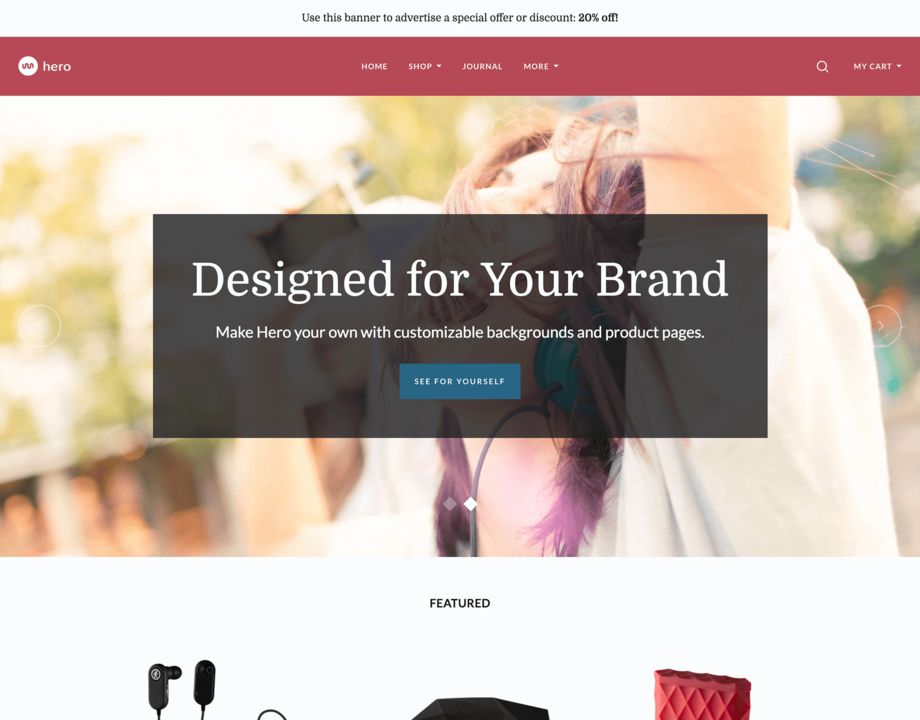 Hero is a flexible and feature-rich theme designed to wow shoppers. Its unique product grid and impactful use of white space call attention to your products, while its customizable background lets you tailor your theme to perfection. Powerful enough to handle any size of inventory, Hero is ideal for boutique and enterprise stores alike.