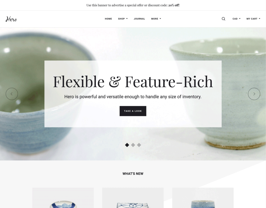 Hero is a flexible and feature-rich theme designed to wow shoppers. Its unique product grid and impactful use of white space call attention to your products, while its customizable background lets you tailor your theme to perfection. Powerful enough to handle any size of inventory, Hero is ideal for boutique and enterprise stores alike.