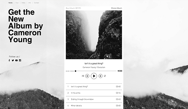 Captivate fans with this cool one-page music website template, perfect for musicians and bands alike. With a striking block layout, this is the perfect website template for any up and coming musician that wants to be noticed. Simply personalize the text and upload your own videos and music to get your presence live on the web today!