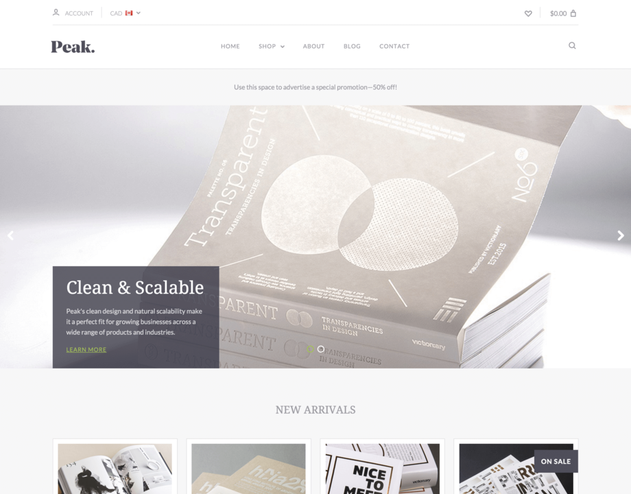 Peak is the ultimate choice for high-volume sellers. Powerful enough to handle any size of catalog, Peak’s clean design supports a wide range of products and industries. Toggle between featured and best-selling items on your homepage, advertise promotions in a sales-ready slideshow, and convert customers with a theme that’s the height of ecommerce.