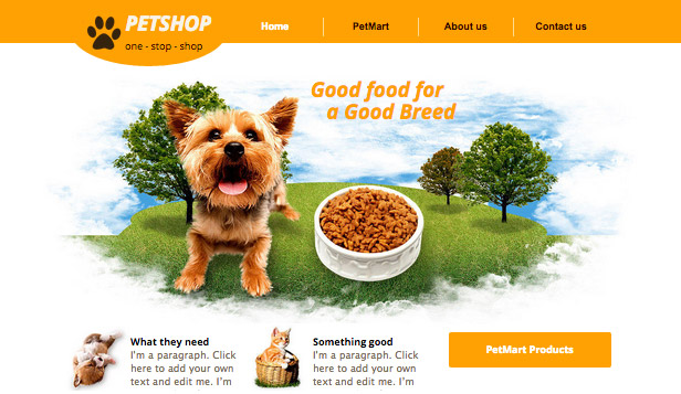 Bright colors and playful illustrations give this template a friendly feel. This is the perfect place to showcase your products and share your philosophy and expertise. Create a website and take your pet supply store online!