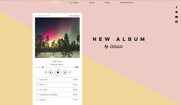 Build your online stardom with this bold and edgy one page music website template. Fully customizable, simply upload a background image to reflect your brand and personalize the text to get your name out there. Promote, track and sell you music by uploading either single tracks or albums to Wix Music and watch your songs are heard worldwide on the web!