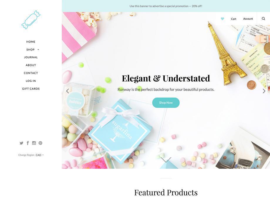 Runway is a gallery theme for stores with exceptional style. Create a memorable first impression with stunning full-width images, tidy sidebar navigation, and homepage features designed to invite customer engagement. Elegant and understated, Runway is a perfect backdrop for your high-end products.