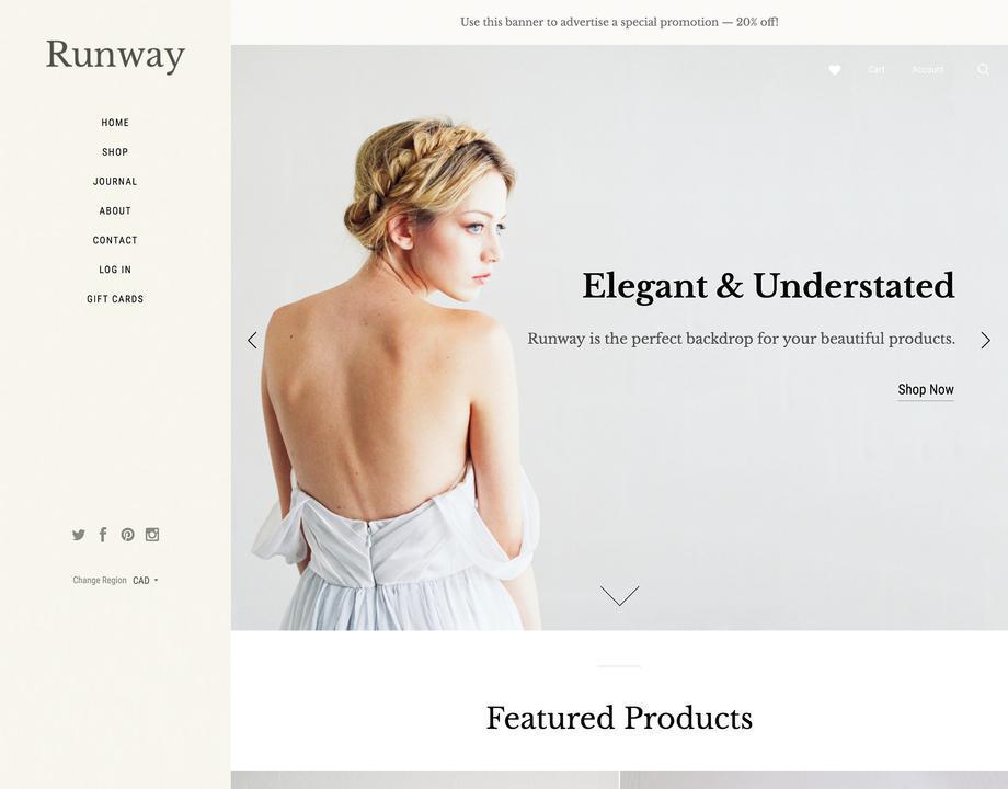 Runway is a gallery theme for stores with exceptional style. Create a memorable first impression with stunning full-width images, tidy sidebar navigation, and homepage features designed to invite customer engagement. Elegant and understated, Runway is a perfect backdrop for your high-end products.