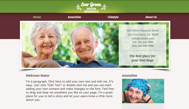 Welcome seniors to your assisted living facility with this warm and friendly template. Add text to introduce your staff members, special services, and accommodation options. Upload photos to give visitors a glimpse of the unique lifestyle available at your establishment.