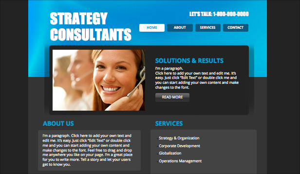 A polished and information-based template perfect for your consulting or financial firm. The ample space for text allows you to focus attention on your services, qualifications, and professional vision. Create a website to take control of your online presence!