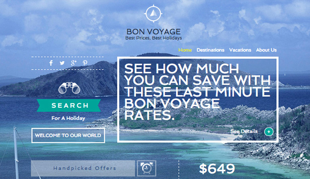 An exotic theme ready to put your travel agency on the map. Promote your vacation packages and entice travelers with images of your glamorous locations. Adjust the color scheme, fonts, and design to suit your business needs.
